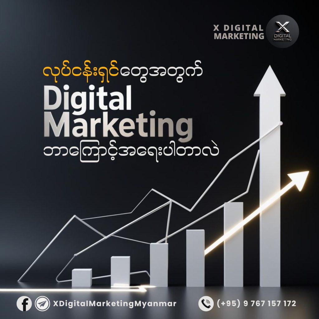 လုပ်ငန်းရှင်တွေအတွက် ဘာကြောင့် အရေးပါတာလဲ။ Digital Marketing ဟာ ဒီနေ့ခေတ် လုပ်ငန်းရှင်တွေအတွက် မရှိမဖြစ် အရေးပါတဲ့ အကြောင်းရင်းတွေ အများကြီး ရှိပါတယ်။ အဓိက အကျဆုံး အချက်တွေကို အနည်းငယ်မြင်သာအောင် တင်ပြပေးချင်ပါတယ်။ 1. Customer တွေ အများဆုံးရှိရာ နေရာ (Customer Presence): အခုခေတ်မှာ လူတွေက အချိန်အများစုကို အင်တာနက်ပေါ်မှာ ကုန်ဆုံးနေကြပါပြီ။ ဖုန်းသုံးနေကြပြီ။ ဒါကြောင့် ကိုယ့်ကြေငြာတွေကို လူတွေရှိတဲ့နေရာကို လိုက်သွားဖို့ လိုပါတယ်။ Digital Marketing က ဒါကို လုပ်ဆောင်ပေးပါတယ်။ 2. ကုန်ကျစရိတ် သက်သာပြီး ပိုမိုထိရောက် (Cost-Effective & Efficient): ရိုးရာကြေငြာတွေနဲ့ နှိုင်းယှဉ်ရင်…